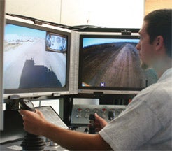 The Range Master - affectionately known at Peterson as the Bomb Buster – is outfitted with body armor and telemetry gear for remote-controlled “real time” munitions clearing up to one mile away. It is one of our coolest innovations to date, the Big Boys version of a videogame/remote-control tractor all rolled into one. The operator sits in a chair inside a trailer surrounded by three big screen monitors and a panel full of switches and joysticks. The “Virtual Cab” was fabricated with the help of radio/video vendor A.R.A. and is the ultimate video game. It allows the “operator” to control the scraper from a mile away, through hydraulic slave controls, and five video cameras that transmit visuals so the operator can see where he’s going and how various parts of the machine are functioning. Fail-safe overrides are built into the system in case something goes wrong.