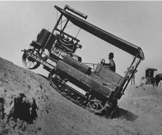 Holt's first track-layer used on a field test near Stockton, CA in 1904. The new machine was used primarily for pulling agricultural implements.