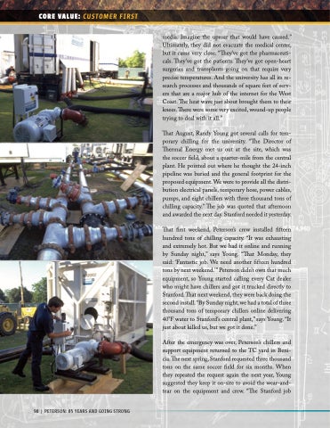 After the emergency was over, Peterson’s chillers and support equipment returned to the TC yard in Beni- cia. The next spring, Stanford requested three thousand tons on the same soccer field for six months. When they repeated the request again the next year, Young suggested they keep it on-site to avoid the wear-and- tear on the equipment and crew. “The Stanford job