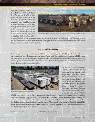 a PSPS event and everyone in that neighborhood is upset because the wind is not blowing and the conditions don’t look hazardous,” explains Schalk. “What they don’t understand is that the transmission lines from the substation to their neighborhood may be on the other side of the hill where it’s extremely windy, so they don’t see the lines slapping around and the potential danger.”That’s exactly what happened for the first two PSPS events. There was no fire anywhere near the outage areas. Instead, high winds and high temperatures were the red flags that prompted those shutoffs.