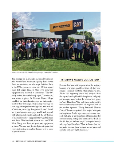 Peterson has been able to grow with the industry because of a large specialized team of sixty em- ployees—some in-territory, others at remote sites. “From the beginning, we’ve had support from the top to hire highly skilled engineers and proj- ect managers even before the concept was prov- en,” says Hamilton. “We took those risks and it’s worked out really well for us for Big Data and all our market segments.” Today, Peterson’s Mission Critical Team is comprised of 24 project managers and engineers, 3 sales reps, management and sup- port staff, plus a traveling team of technicians for commissioning, testing and certification. “Back in the old days, we had one project manager for every sales rep,” says Hamilton. “Now we have a four-to- one ratio because these projects are so large and complex with very tight deadlines.”