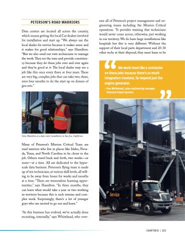 Many of Peterson’s Mission Critical Team are road warriors who live in places like Idaho, Neva- da, Texas, and North Carolina to be closer to the job. Others travel back and forth, two weeks—or more—at a time. All are dedicated to the hyper- scale data business. Peterson’s flying team is made up of ten technicians, at various skill levels, all will- ing to be away from home for weeks and months at a time. “These are tremendous learning oppor- tunities,” says Hamilton. “In three months, they can learn what would take a year or two working in-territory because this is such intense and com- plex work. Surprisingly, there’s a lot of younger guys who are excited to go out and learn.”