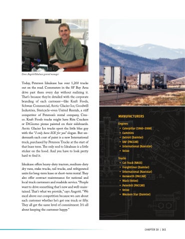 Today, Peterson Idealease has over 1,200 trucks out on the road. Commuters in the SF Bay Area drive past them every day without realizing it. That’s because they’re detailed with the corporate branding of each customer—like Kraft Foods, Schwan Commercial, Arctic Glacier Ice, Goodwill Industries, Stericycle–even United Rentals, a stiff competitor of Peterson’s rental company, Cres- co. Kraft Foods trucks might have Ritz Crackers or DiGiorno pizzas painted on their sideboards. Arctic Glacier Ice trucks sport the little blue guy with the “I only have ICE for you” slogan. But un- derneath each coat of paint is a new International truck, purchased by Peterson Trucks at the start of that lease term. The only nod to Idealease is a little sticker on the hood. And you have to look pretty hard to find it.