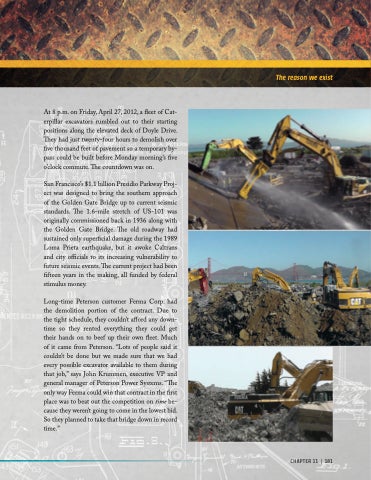 Long-time Peterson customer Ferma Corp. had the demolition portion of the contract. Due to the tight schedule, they couldn’t afford any down- time so they rented everything they could get their hands on to beef up their own fleet. Much of it came from Peterson. “Lots of people said it couldn’t be done but we made sure that we had every possible excavator available to them during that job,” says John Krummen, executive VP and general manager of Peterson Power Systems. “The only way Ferma could win that contract in the first place was to beat out the competition on time be- cause they weren’t going to come in the lowest bid. So they planned to take that bridge down in record time.”