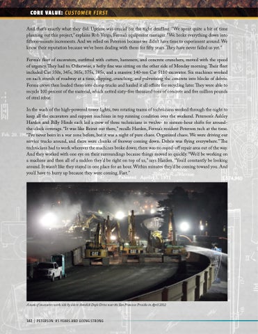 In the wash of the high-powered tower lights, two rotating teams of technicians worked through the night to keep all the excavators and support machines in top running condition over the weekend. Peterson’s Ashley Harden and Billy Hinds each led a crew of three technicians in twelve- to sixteen-hour shifts for around- the-clock coverage. “It was like Beirut out there,” recalls Harden, Ferma’s resident Peterson tech at the time. “I’ve never been in a war zone before, but it was a night of pure chaos. Organized chaos. We were driving our service trucks around, and there were chunks of freeway coming down. Debris was flying everywhere.” The technicians had to work wherever the machines broke down; there was no roped-off repair area out of the way. And they worked with one eye on their surroundings because things moved so quickly. “We’d be working on a machine and then all of a sudden they’d be right on top of us,” says Harden. “You’d constantly be looking around. It wasn’t like they stayed in one place for an hour. Within minutes they’d be coming toward you. And you’d have to hurry up because they were coming. Fast.”