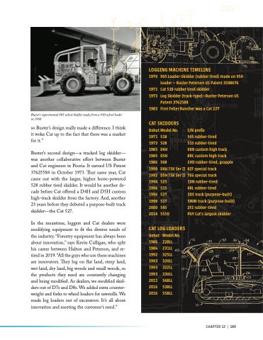 Buster’s second design—a tracked log skidder— was another collaborative effort between Buster and Cat engineers in Peoria. It earned US Patent 37625584 in October 1973. That same year, Cat came out with the larger, higher horse-powered 528 rubber tired skidder. It would be another de- cade before Cat offered a D4H and D5H custom high-track skidder from the factory. And, another 23 years before they debuted a purpose-built track skidder—the Cat 527.