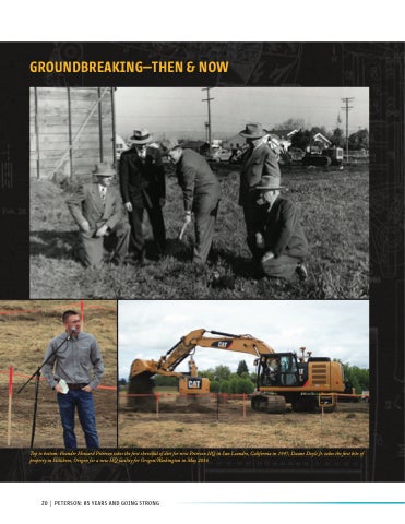Top to bottom: Founder Howard Peterson takes the first shovelful of dirt for new Peterson HQ in San Leandro, California in 1947; Duane Doyle Jr. takes the first bite of property in Hillsboro, Oregon for a new HQ facility for Oregon/Washington in May 2016