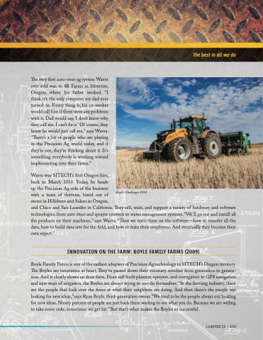 Boyle Family Farms is one of the earliest adopters of Precision Ag technology in SITECH’s Oregon territory. The Boyles are innovators at heart. They’ve passed down their visionary mindset from generation to genera- tion. And it clearly shows on their farm. From self-built planters, sprayers, and corrugators to GPS navigation and new ways of irrigation, the Boyles are always trying to out-do themselves. “In the farming industry, there are the people that look over the fence at what their neighbors are doing. And then there’s the people out looking for new ideas,”says Ryan Boyle,third-generation owner.“We tend to be the people always out looking for new ideas. Ninety percent of people are just back there waiting to see what you do. Because we are willing to take some risks, sometimes we get bit.” But that’s what makes the Boyles so successful.