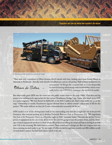 ODS landed most of the development work in the surrounding area and also caught the eye of Prudential Insurance, who was just gearing up to develop Hacienda Business Park in Pleasanton, CA. “We negotiated that deal at the Pleasanton Hotel on a Thursday night in 1983,” recounts Gates. “The next day, we had twenty pieces of equipment on the job. It was all for show. The city was going to turn the project down, and the devel- oper wanted equipment out there to show intent. We pirated everything we could and had it moving in at 4:00 and 5:00 in the morning. We didn’t have a contract. There wasn’t even a design yet. But our scrapers were out there, running around, ready to go.” In one night, DeSilva locked in eighteen months and $86 million worth of work before anyone else had more than a whiff of the job.