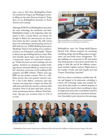 Although SITECH and BuildingPoint draw from the same technology, the similarities end there. BuildingPoint begins at the beginning, when the project is still a concept. Before any tractors are brought in. Before the subcontractors are chosen. Even before the bid is awarded. The shift toward these new technologies started gaining traction in 2009 with the rise of BIM (Building Information Modeling). Projects were getting more complicat- ed than a set of blueprints could handle. “Twenty to thirty years ago, buildings had four corners. They were basically square boxes,” says David Larsson, a twenty-year veteran of construction technolo- gy. “Today, they have arcs and overhangs and roof gardens. Architects are designing complex build- ings that are extremely difficult to construct in real life.” And they can because of 3D modeling CAD programs and BIM software. “Fifteen years ago, BIM was just another acronym. Now it’s a full- blown process that every general contractor uses. It’s a way of life. Before, contractors used tape measures and string lines to figure out where the walls went and where the staircase or elevator shaft should be. Now it’s all done with lasers and elec- tronic measurement devices—Robotic Total Solu- tions—that give you accuracies down to 1/32 of an inch.”
