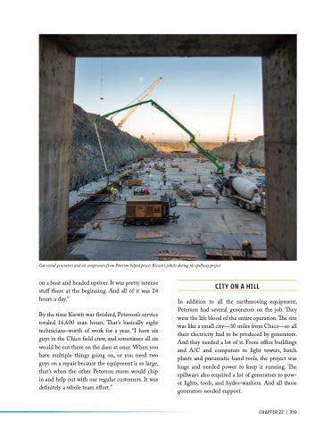 In addition to all the earthmoving equipment, Peterson had several generators on the job. They were the life blood of the entire operation. The site was like a small city—30 miles from Chico—so all their electricity had to be produced by generators. And they needed a lot of it. From office buildings and A/C and computers to light towers, batch plants and pneumatic hand tools, the project was huge and needed power to keep it running. The spillways also required a lot of generators to pow- er lights, tools, and hydro-washers. And all those generators needed support.