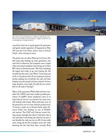 Many of the generators Waite delivered were tow- ables (25–70kW) and some smaller portable gen- erators (3–12kW). Some employees came in to help load up Cresco’s ten-wheeler, but many were still dealing with family. Waite delivered most of the generators, one at a time, with his pickup truck. “I towed a couple out to French Gulch where Pe- terson Power was working on one of PG&E’s sub-stations. The CHP and Caltrans weren’t let- ting anyone through, but when I told them who I was and what I was doing, the chief let me pass. I was literally the only one out on 299. It was really eerie seeing all the fire retardant across the road, knowing the fire had been there recently. Both