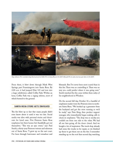 On the second full day, October 10, a handful of employees made it into the Peterson store in north- ern Santa Rosa. “We hooked up a generator from the backyard and got the store running so we’d be ready,” says Nate King, then product support manager, who immediately began making calls to check on employees. “The shop was so smoky you couldn’t see from one side to the other. We had all our fans going, all the doors closed. And we bought a lot of respirators. The truck shop already had some fire trucks in for repair, so we finished up those to get them out on the fire. I remember standing up on the roof that second day, watching