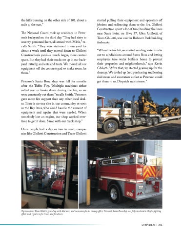 Top to bottom: Team Ghilotti geared up with skid steers and excavators for the cleanup effort; Peterson’s Santa Rosa shop was fully involved in the fire-fighting effort, with repairs to fire trucks and fire dozers.