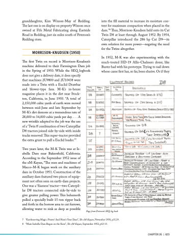 into the fill material to increase its moisture con- tent for maximum compaction when placed in the dam.”8 Thus, Morrison-Knudsen held onto its Cat Twin D8 at least through August 1952. By 1954, Caterpillar introduced the 286 hp Cat D9—its own solution for more power—negating the need for the Twins altogether.