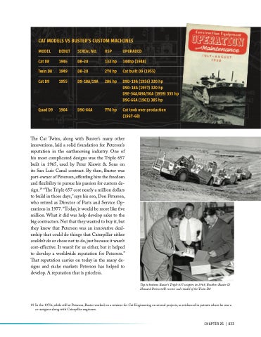 The Cat Twins, along with Buster’s many other innovations, laid a solid foundation for Peterson’s reputation in the earthmoving industry. One of his most complicated designs was the Triple 657 built in 1965, used by Peter Kiewit & Sons on its San Luis Canal contract. By then, Buster was part-owner of Peterson, affording him the freedom and flexibility to pursue his passion for custom de- sign.19 “The Triple 657 cost nearly a million dollars to build in those days,” says his son, Don Peterson, who retired as Director of Parts and Service Op- erations in 1977. “Today, it would be more like five million. What it did was help develop sales to the big contractors. Not that they wanted to buy it, but they knew that Peterson was an innovative deal- ership that could do things that Caterpillar either couldn’t do or chose not to do, just because it wasn’t cost-effective. It wasn’t for us either, but it helped to develop a worldwide reputation for Peterson.” That reputation carries on today in the many de- signs and niche markets Peterson has helped to develop. A reputation that is priceless.