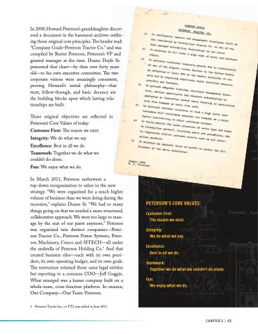 In 2008, Howard Peterson’s granddaughter discov- ered a document in the basement archives outlin- ing those original core principles. The header read: “Company Goals–Peterson Tractor Co.” and was compiled by Buster Peterson, Peterson’s VP and general manager at the time. Duane Doyle Sr. presented that chart—by then over forty years old—to his own executive committee. The two corporate visions were amazingly consistent, proving Howard’s initial philosophy—that trust, follow-through, and basic decency are