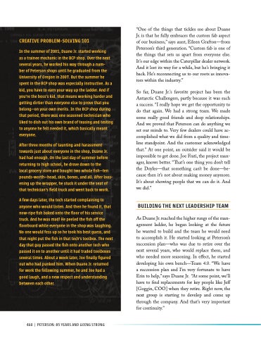 “One of the things that tickles me about Duane Jr. is that he fully embraces the custom fab aspect of our business,” says aunt, Eileen Grafton—from Peterson’s third generation. “Custom fab is one of the things that sets us apart from everyone else. It’s our edge within the Caterpillar dealer network. And it lost its way for a while, but he’s bringing it back. He’s reconnecting us to our roots as innova- tors within the industry.”
