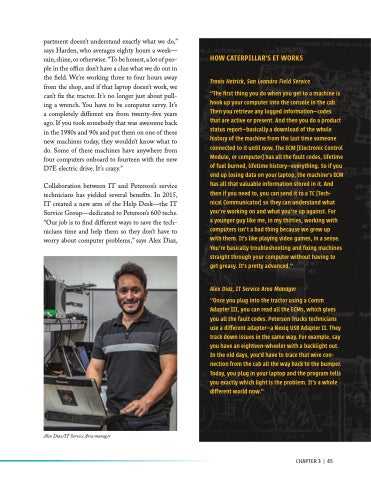 partment doesn’t understand exactly what we do,” says Harden, who averages eighty hours a week— rain,shine,or otherwise.“To be honest,a lot of peo- ple in the office don’t have a clue what we do out in the field. We’re working three to four hours away from the shop, and if that laptop doesn’t work, we can’t fix the tractor. It’s no longer just about pull- ing a wrench. You have to be computer savvy. It’s a completely different era from twenty-five years ago. If you took somebody that was awesome back in the 1980s and 90s and put them on one of these new machines today, they wouldn’t know what to do. Some of these machines have anywhere from four computers onboard to fourteen with the new D7E electric drive. It’s crazy.”