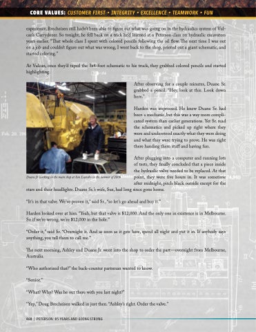 experience, Brecheisen still hadn’t been able to figure out what was going on in the hydraulics system of Vul- can’s Carrydozer. So tonight, he fell back on a trick he’d learned at a Peterson class on hydraulic excavators years earlier. “That whole class I spent with colored pencils following the oil flow. The next time I was out on a job and couldn’t figure out what was wrong, I went back to the shop, printed out a giant schematic, and started coloring.”