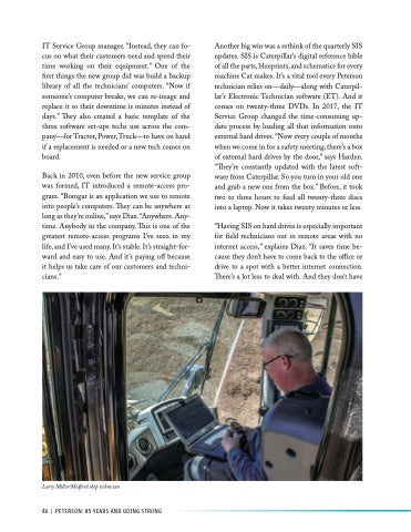 Another big win was a rethink of the quarterly SIS updates. SIS is Caterpillar’s digital reference bible of all the parts, blueprints, and schematics for every machine Cat makes. It’s a vital tool every Peterson technician relies on—daily—along with Caterpil- lar’s Electronic Technician software (ET). And it comes on twenty-three DVDs. In 2017, the IT Service Group changed the time-consuming up- date process by loading all that information onto external hard drives. “Now every couple of months when we come in for a safety meeting, there’s a box of external hard drives by the door,” says Harden. “They’re constantly updated with the latest soft- ware from Caterpillar. So you turn in your old one and grab a new one from the box.” Before, it took two to three hours to feed all twenty-three discs into a laptop. Now it takes twenty minutes or less.