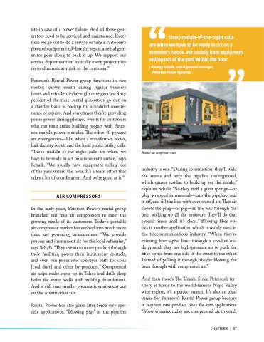 And then there’s The Crush. Since Peterson’s ter- ritory is home to the world-famous Napa Valley wine region, it’s a perfect match. It’s also an ideal venue for Peterson’s Rental Power group because it requires two product lines for one application. “Most wineries today use compressed air to crush